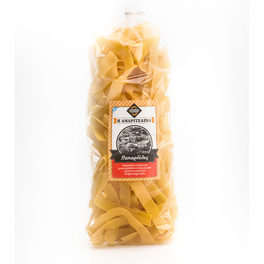 Οι Παπαρδέλες Ανδρίτσαινα είναι παραδοσιακές φαρδιές λωρίδες ζυμαρικών, φτιαγμένες με 100% σιμιγδάλι σκληρού σίτου και αγνά υλικά, χωρίς πρόσθετα ή συντηρητικά. Με σταθερή υφή και πλούσια γεύση, μαγειρεύονται ιδανικά με σάλτσες με βάση το κρέας ή τα μανιτάρια, καθώς συγκρατούν άψογα τα αρώματα και τους χυμούς κάθε πιάτου. Παράγονται στην Ανδρίτσαινα με σεβασμό στην ελληνική ζυμαροποιία και αποτελούν εξαιρετική επιλογή για γευστικά και εντυπωσιακά πιάτα. Παραγγείλετε τώρα από το e-shop μας και ανακαλύψτε την αυθεντική απόλαυση μιας παραδοσιακής παπαρδέλας!