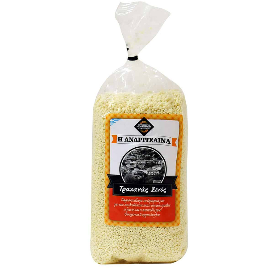 Ο Ξινός Τραχανάς Ανδρίτσαινα αποτελεί κλασική παραδοσιακή συνταγή, φτιαγμένη από αγνό πρόβειο γάλα και σιτάρι, με φυσική ζύμωση που του χαρίζει τη χαρακτηριστική ξινή γεύση. Είναι πλούσιος σε θρεπτικά συστατικά και εύπεπτος, ιδανικός για θέρμανση και ενέργεια, ιδιαίτερα τους κρύους μήνες. Παρασκευάζεται με σεβασμό στην παράδοση, χωρίς συντηρητικά και τεχνητά πρόσθετα, προσφέροντας την αυθεντική ελληνική γεύση που αγαπούν γενιές. Μαγειρεύεται εύκολα σε σούπα ή χυλό και προσφέρει γευστική ζεστασιά σε κάθε γεύμα. Παραγγείλετε τώρα από το e-shop μας και ζήστε την εμπειρία του παραδοσιακού τραχανά!
